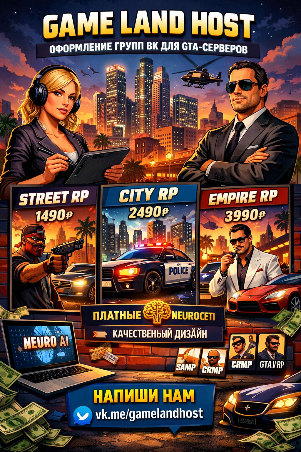 #GameLandHost #GTA #GTARP #SAMP #CRMP #MTA #GTA5RP #ИгровыеСерверы #ОформлениеВК #Нейросети #AIдизайн #RPСервер #GTACommunity 🚓🔥