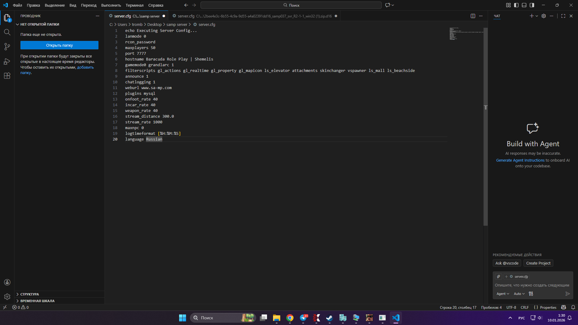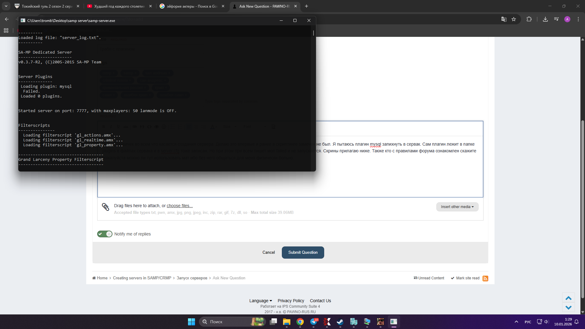 Кусь. Я новичек во всем что касается создания сервера. Делаю это впервые и ранее в скриптинге замечен не был. Я пытаюсь плагин mysql запихнуть в сервак. Сам плагин лежит в папке plugins в файлах сервака и в server.cfg тоже записан. Но при этом при всем пишет мол failed и не запускается. Скрины прилагаю ниже. Также кто с правилами форума ознакомлен скажите пожалуйста можно ли тут использовать мат ибо без него общаться для меня физически больно.